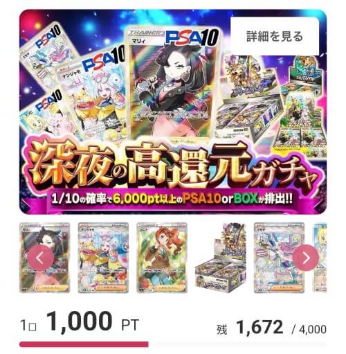 | 特徴 | アド確オリパが多い 100%アド確定オリパ 最低保証付きオリパあり PSA10 ・未開封BOX 爆アドを狙える |